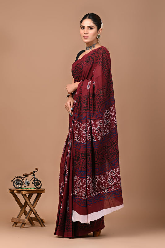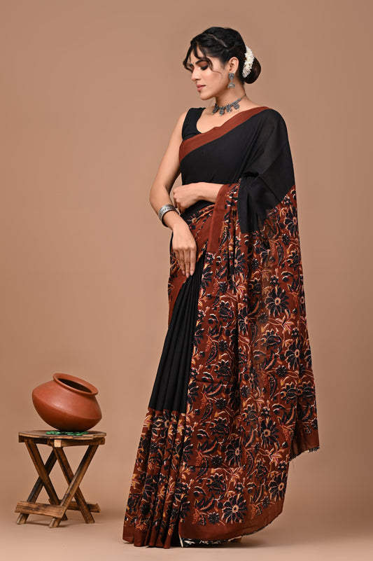 Jaipuri Printed Pure Cotton Mulmul Saree With Blouse