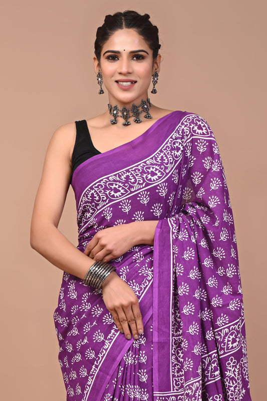 Jaipuri Printed Pure Cotton Mulmul Saree With Blouse
