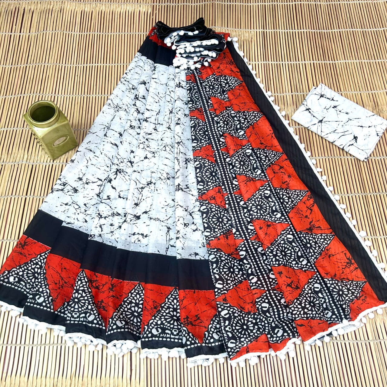 Printed Pure Cotton Mulmul Saree With PomPom Lace