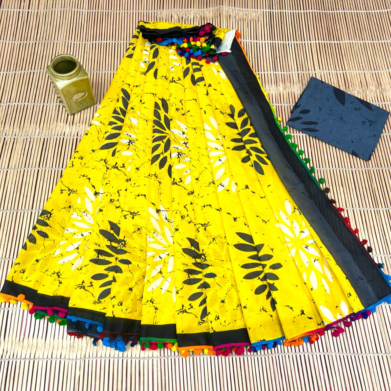 Printed Pure Cotton Mulmul Saree With PomPom Lace