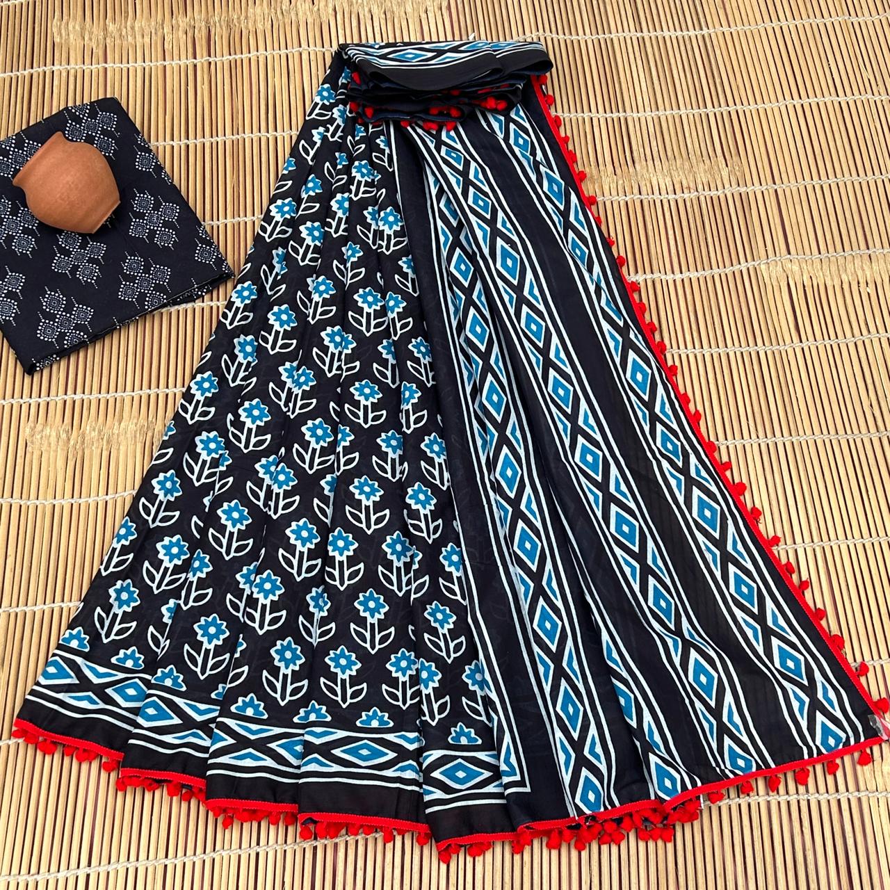 Printed Pure Cotton Mulmul Saree PomPom Lace