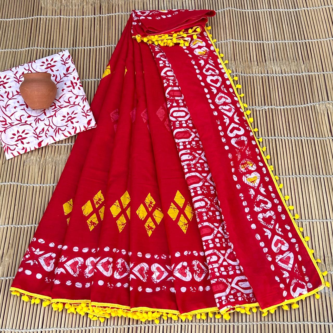 Printed Pure Cotton Mulmul Saree PomPom Lace