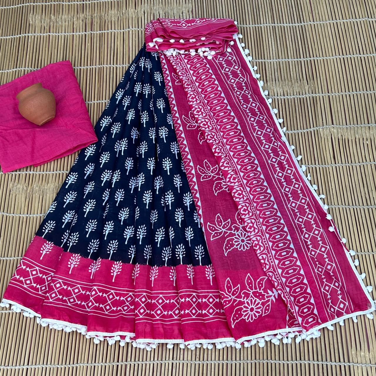 - FABRIC : Mulmul Cotton saree with similar fabric Blouse pc || Work: Printed ,Block print ,Traditional Ethnic Look