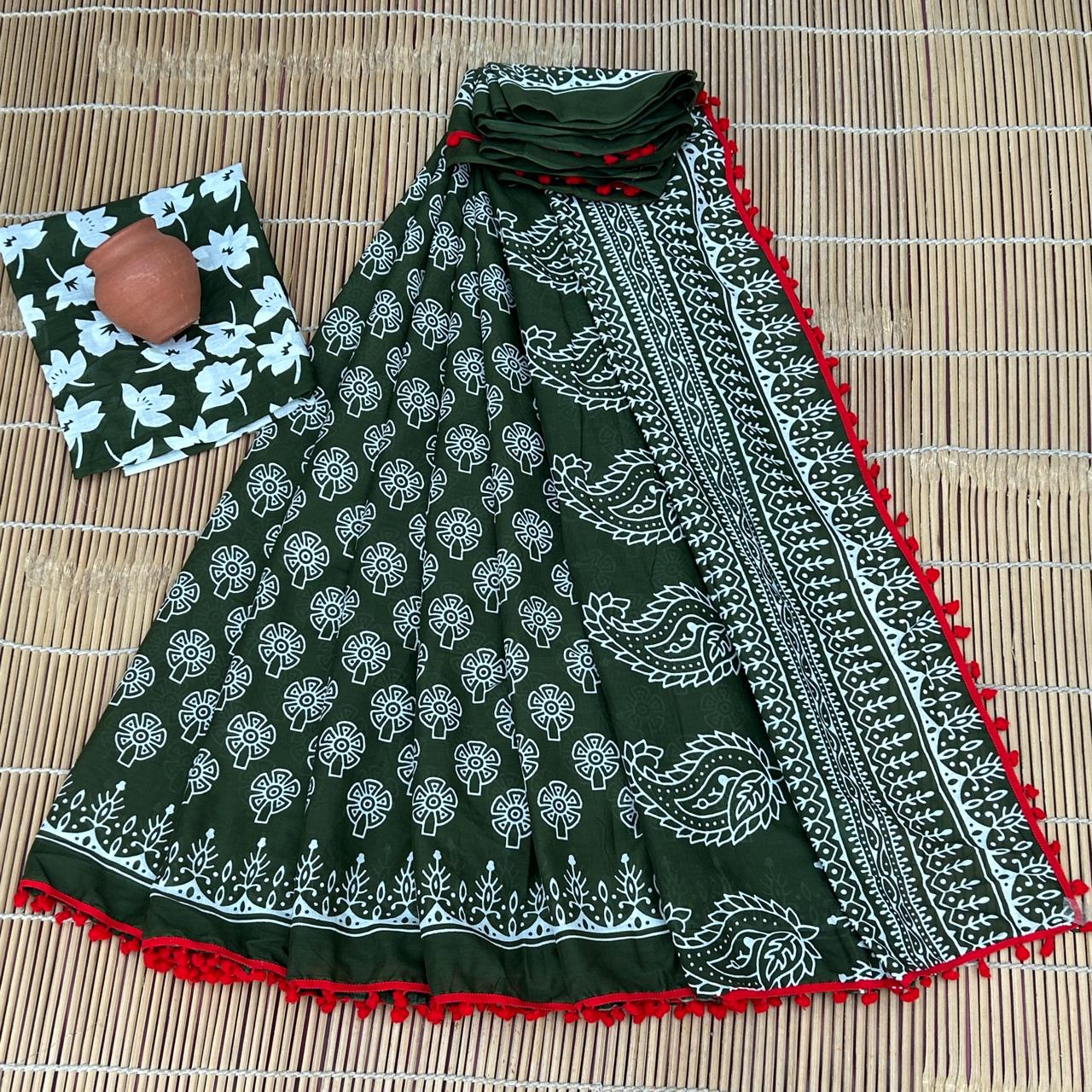 Printed Pure Cotton Mulmul Saree PomPom Lace