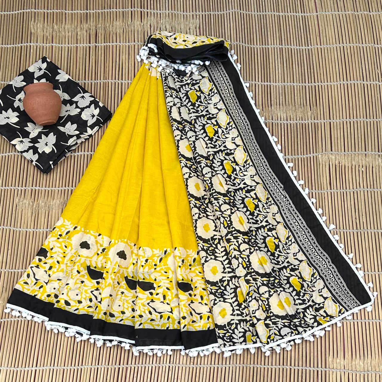 Printed Pure Cotton Mulmul Saree PomPom Lace