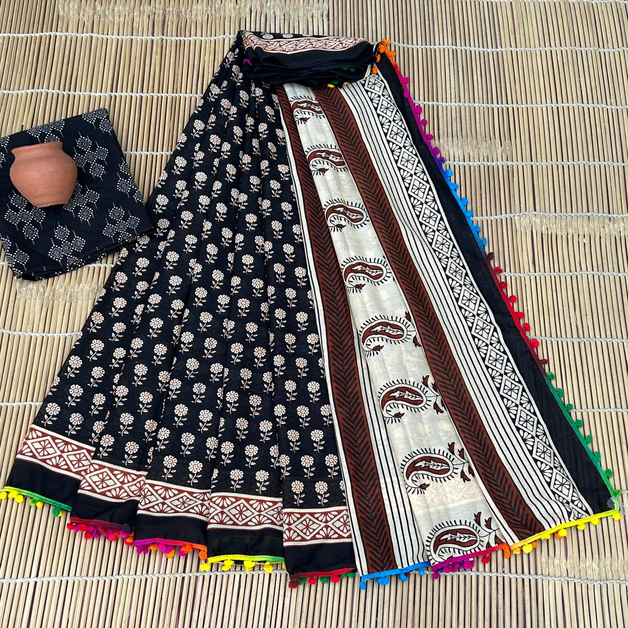 Printed Pure Cotton Mulmul Saree PomPom Lace