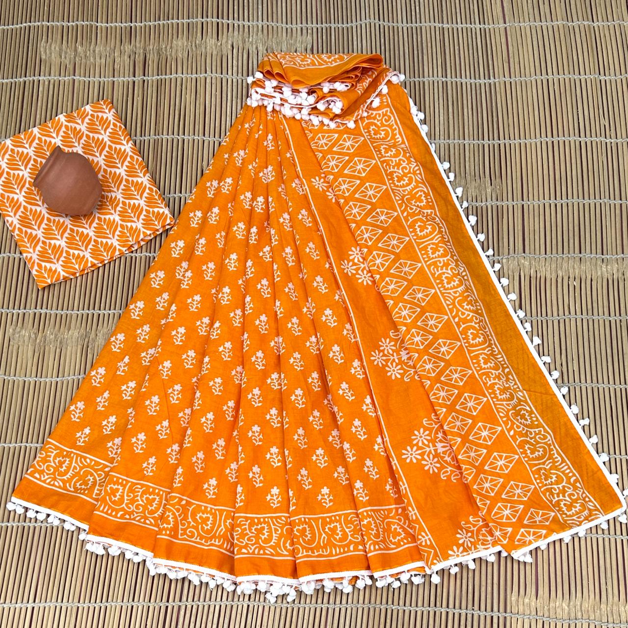 - FABRIC : Mulmul Cotton saree with similar fabric Blouse pc || Work: Printed ,Block print ,Traditional Ethnic Look