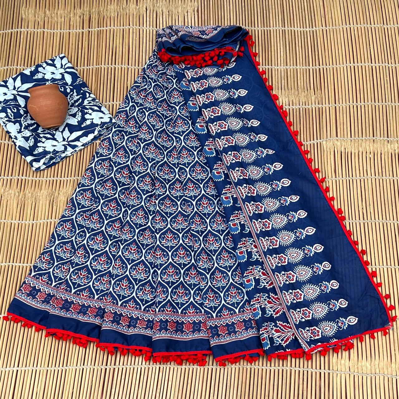 - FABRIC : Mulmul Cotton saree with similar fabric Blouse pc || Work: Printed ,Block print ,Traditional Ethnic Look