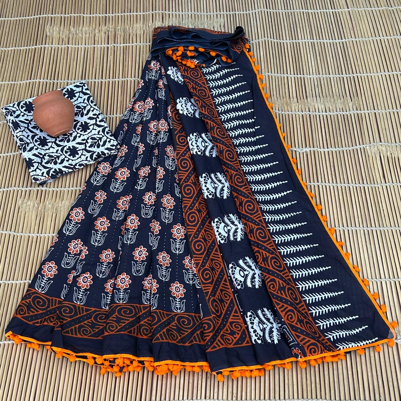 - FABRIC : Mulmul Cotton saree with similar fabric Blouse pc || Work: Printed ,Block print ,Traditional Ethnic Look