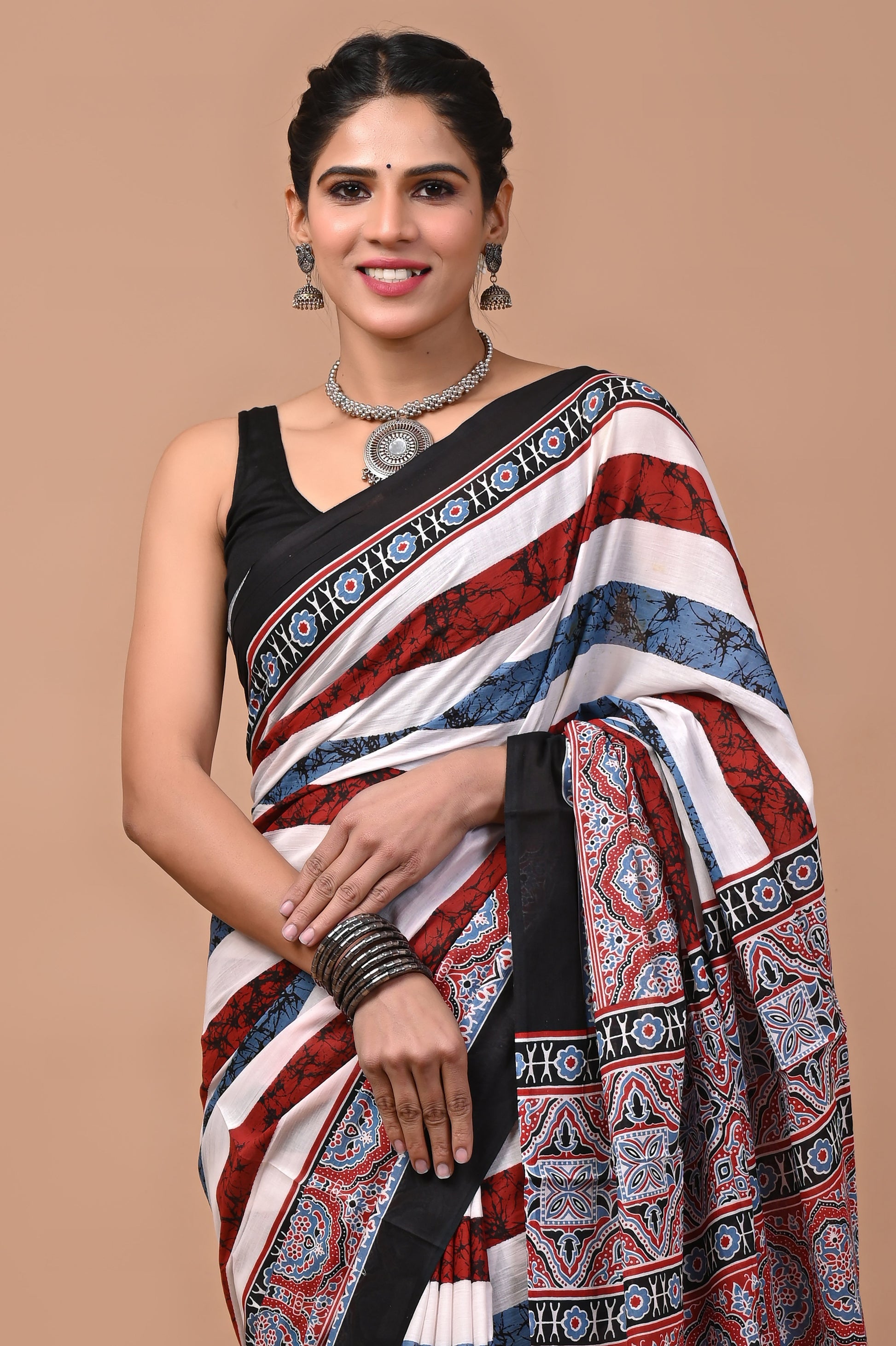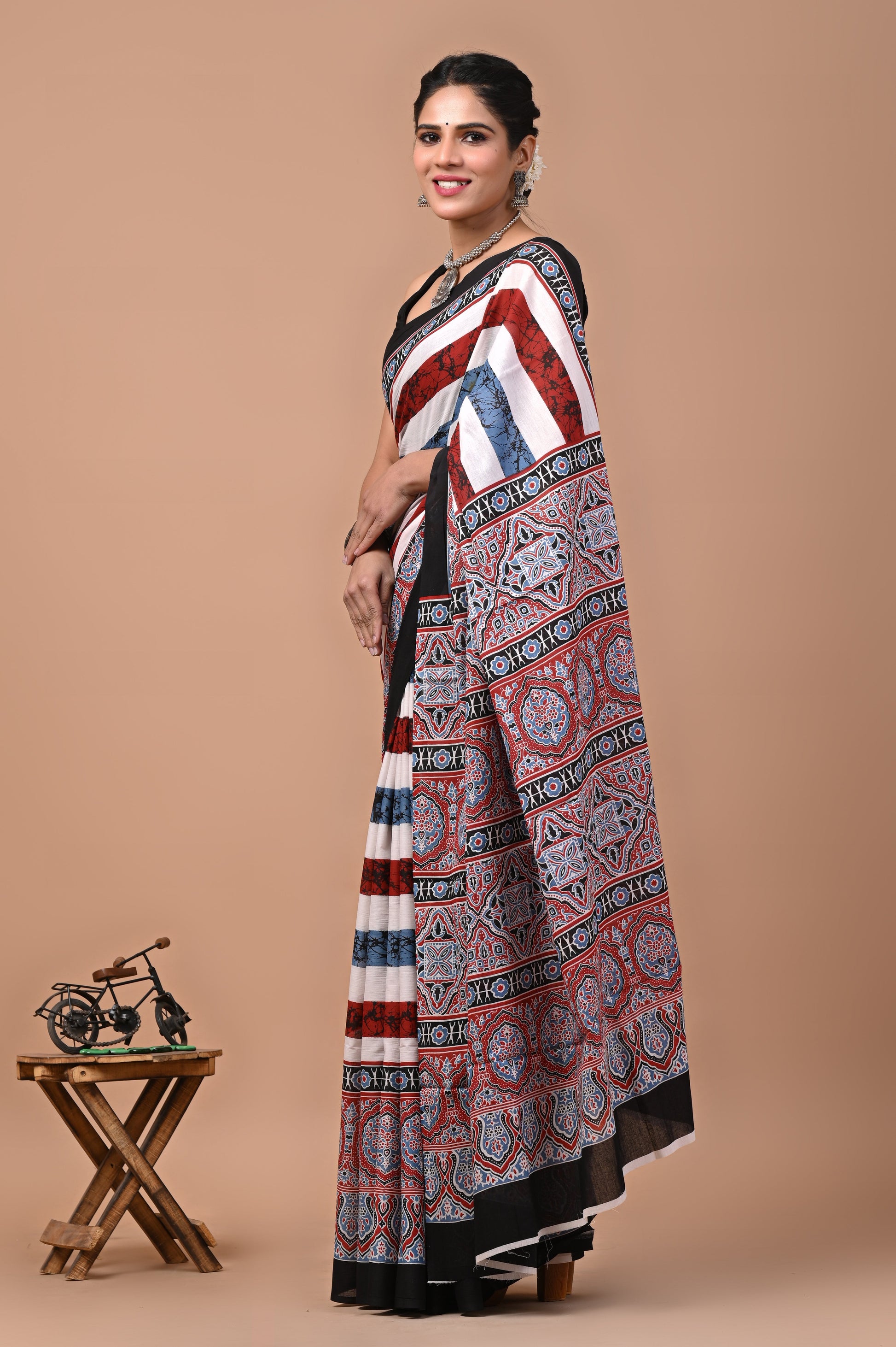 - FABRIC : Mulmul Cotton saree with similar fabric Blouse pc || Work: Printed ,Block print ,Traditional Ethnic Look