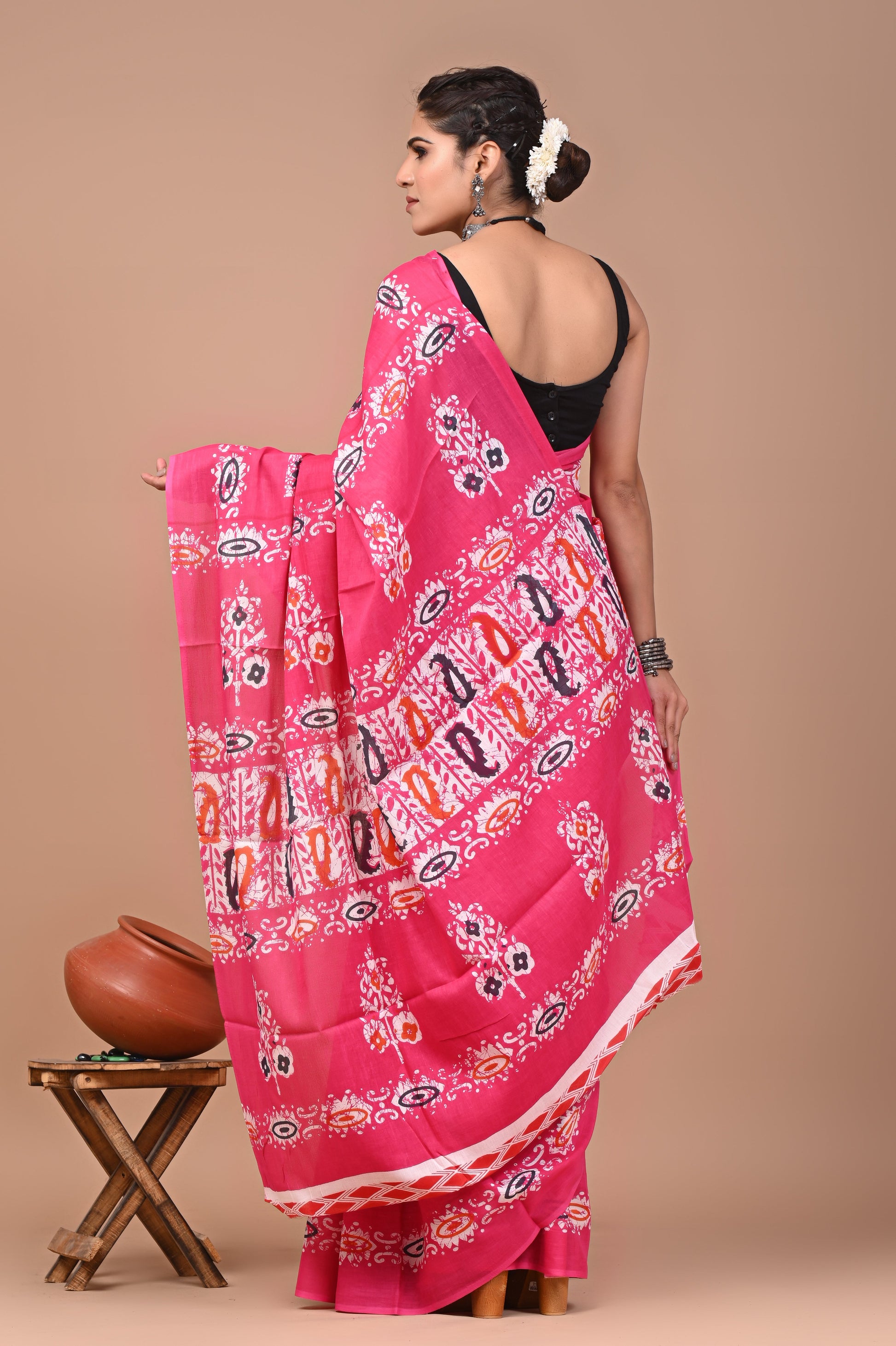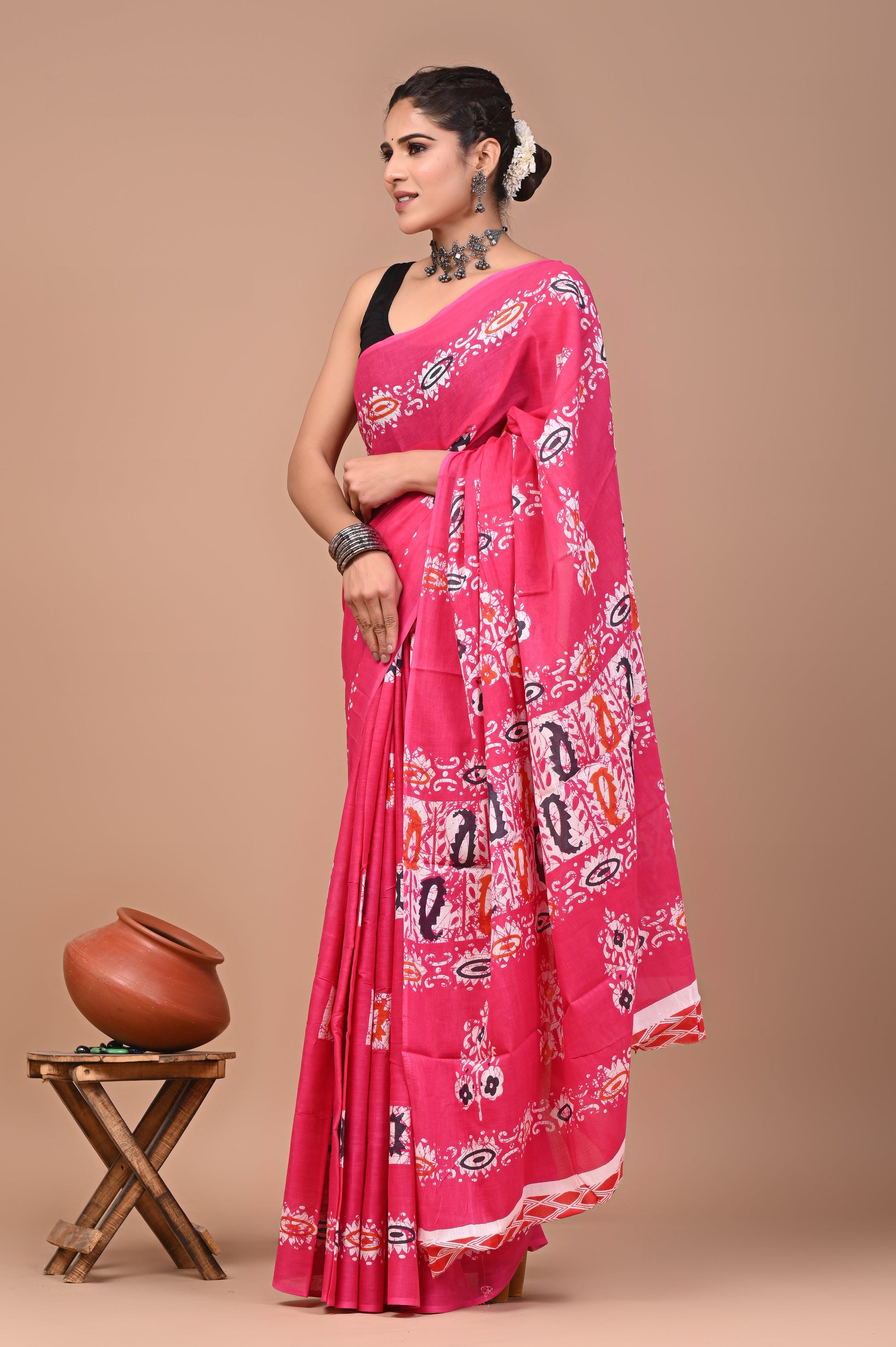 - FABRIC : Mulmul Cotton saree with similar fabric Blouse pc || Work: Printed ,Block print ,Traditional Ethnic Look