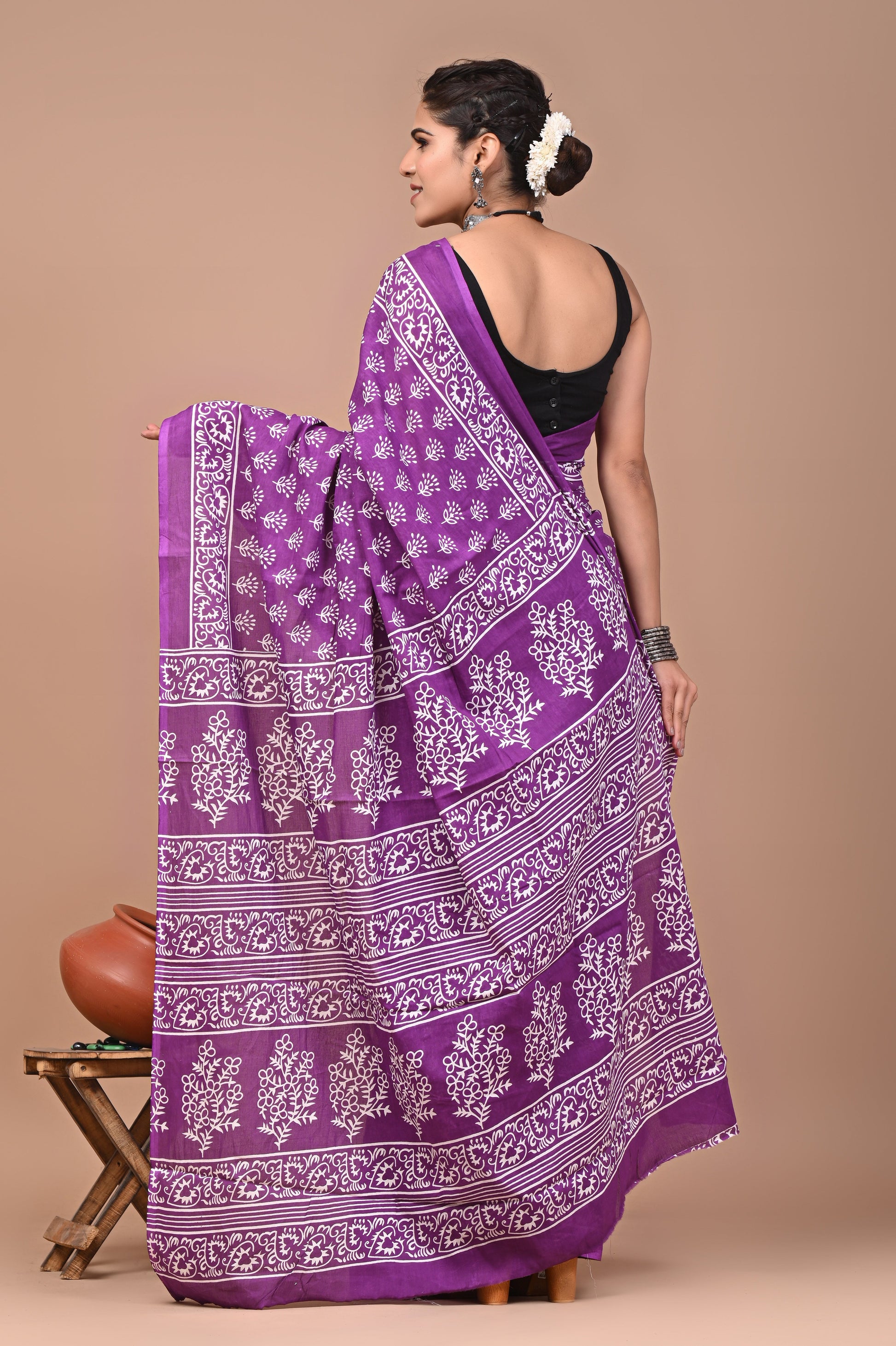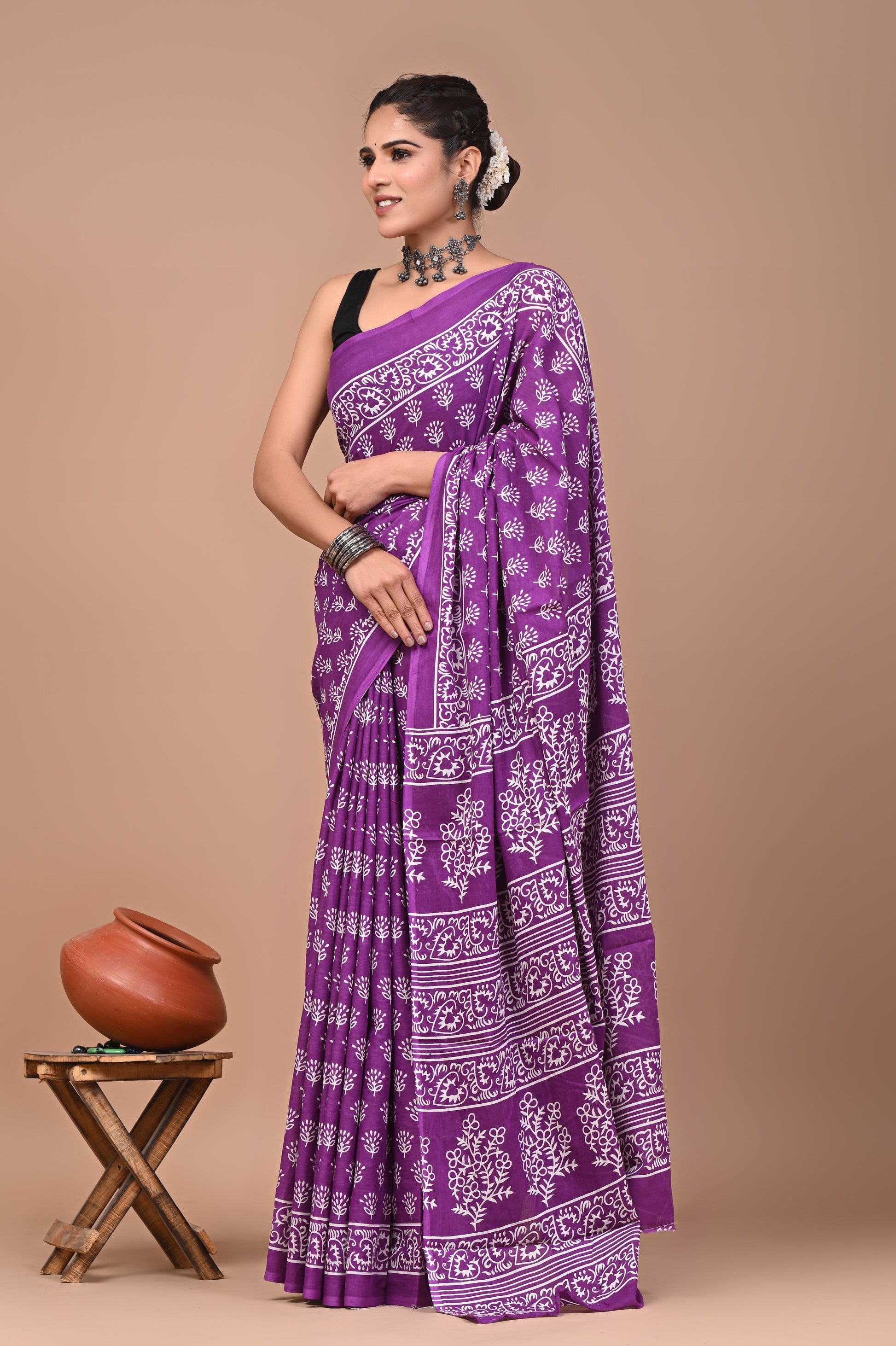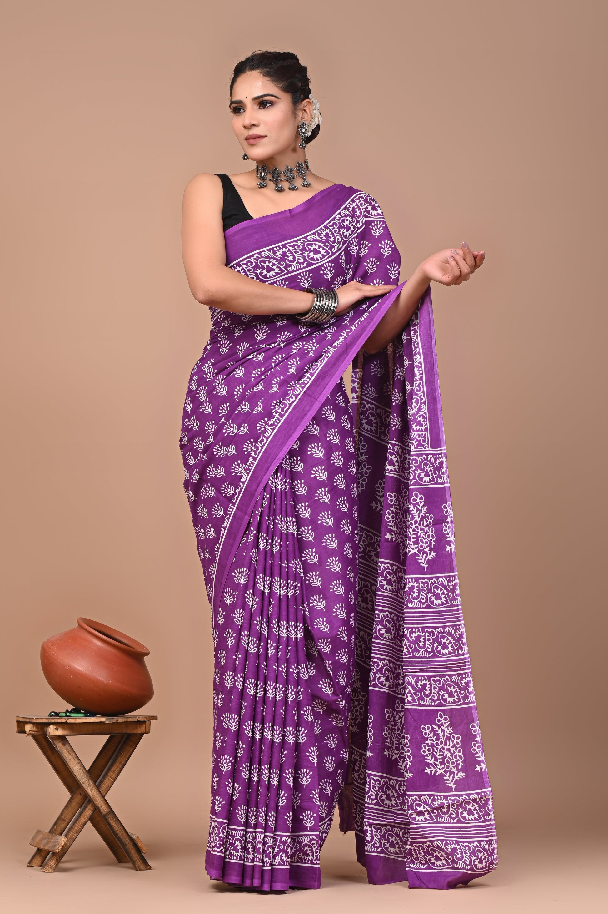 - FABRIC : Mulmul Cotton saree with similar fabric Blouse pc || Work: Printed ,Block print ,Traditional Ethnic Look