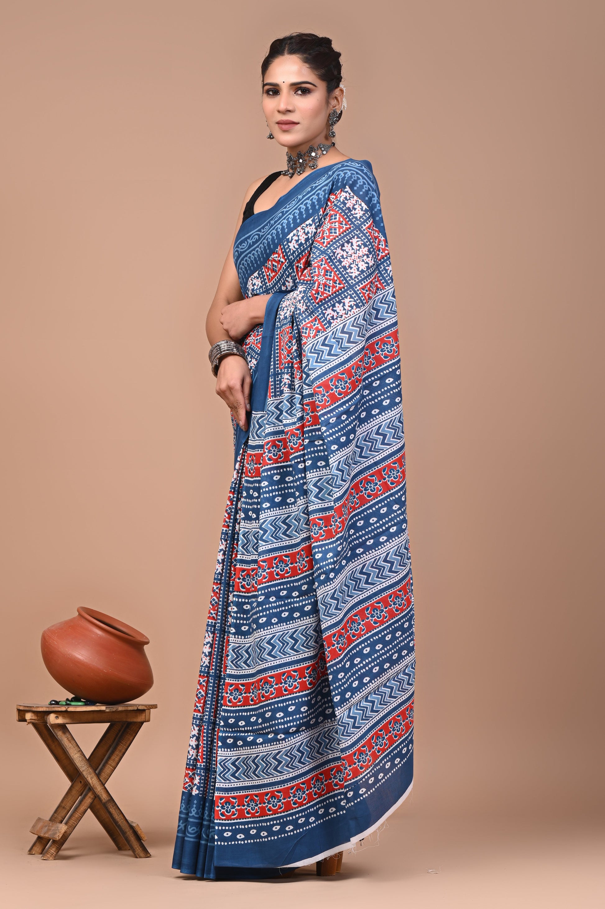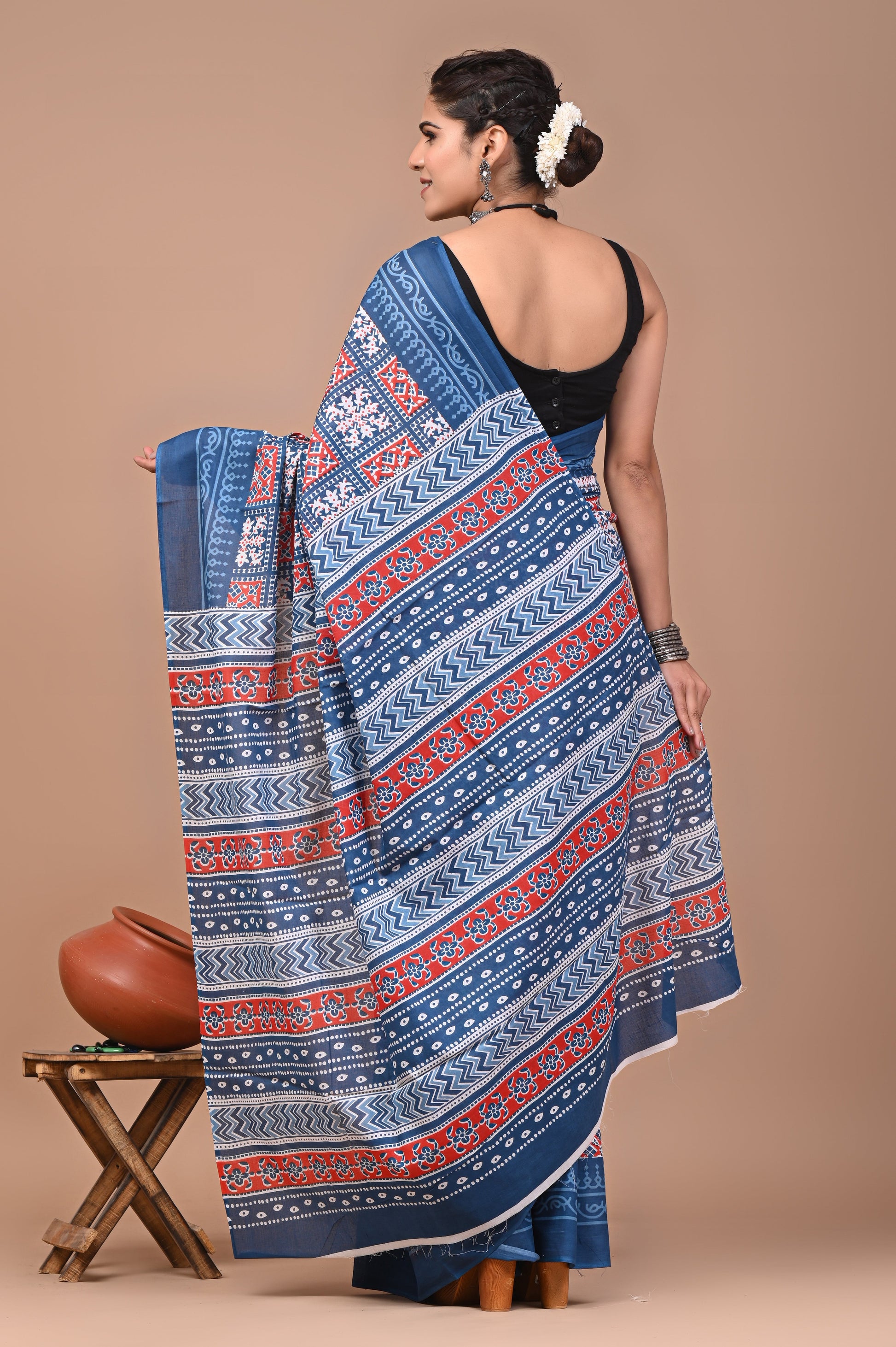 - FABRIC : Mulmul Cotton saree with similar fabric Blouse pc || Work: Printed ,Block print ,Traditional Ethnic Look