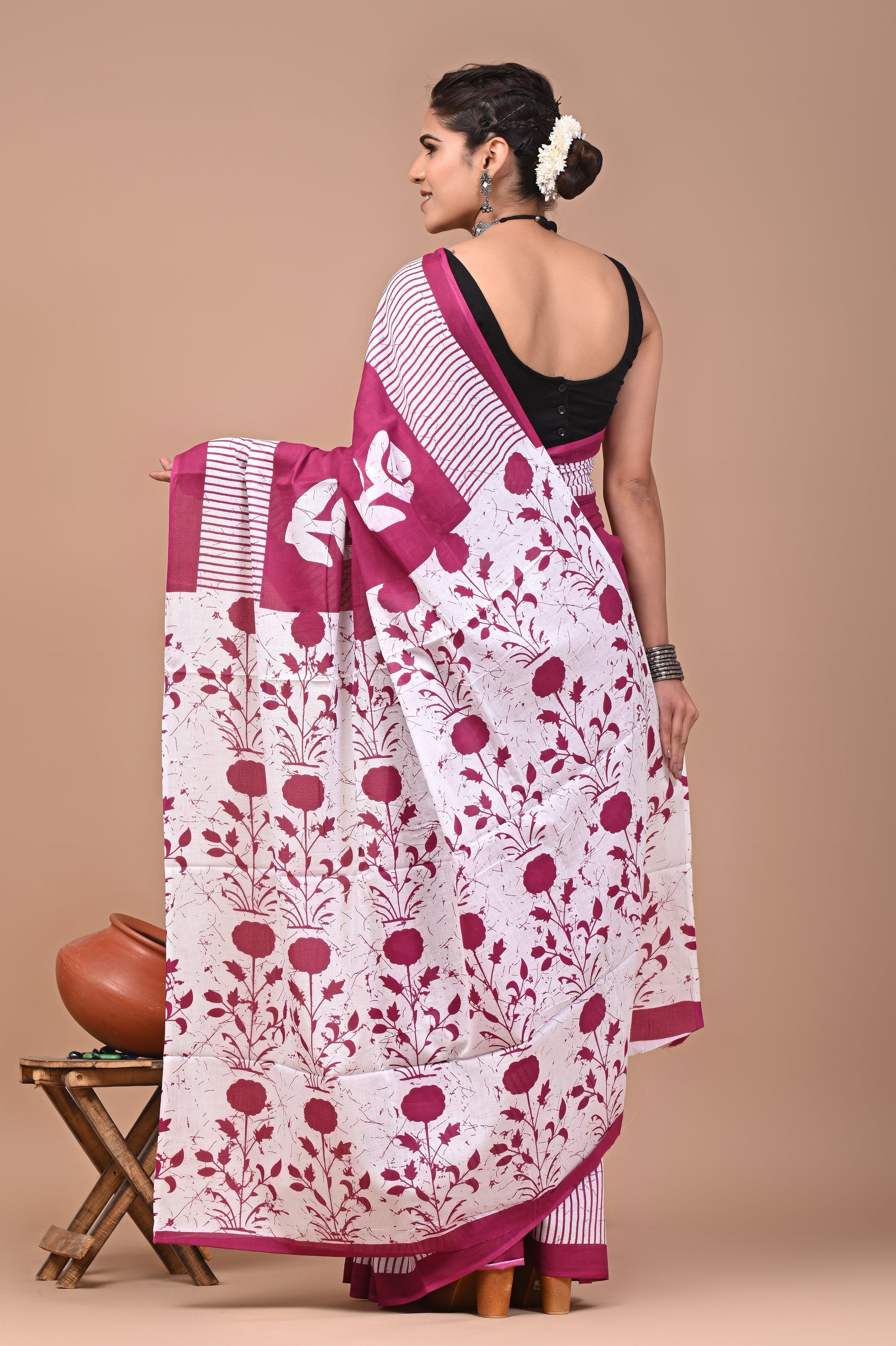 - FABRIC : Mulmul Cotton saree with similar fabric Blouse pc || Work: Printed ,Block print ,Traditional Ethnic Look