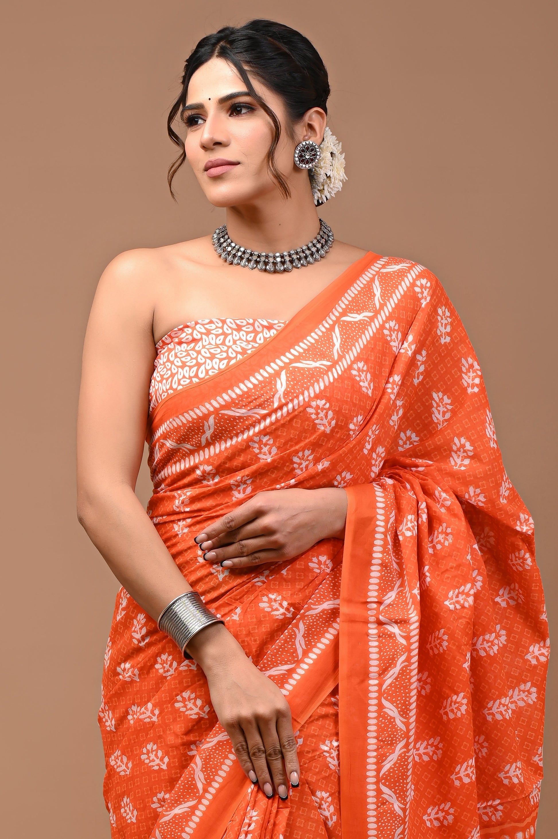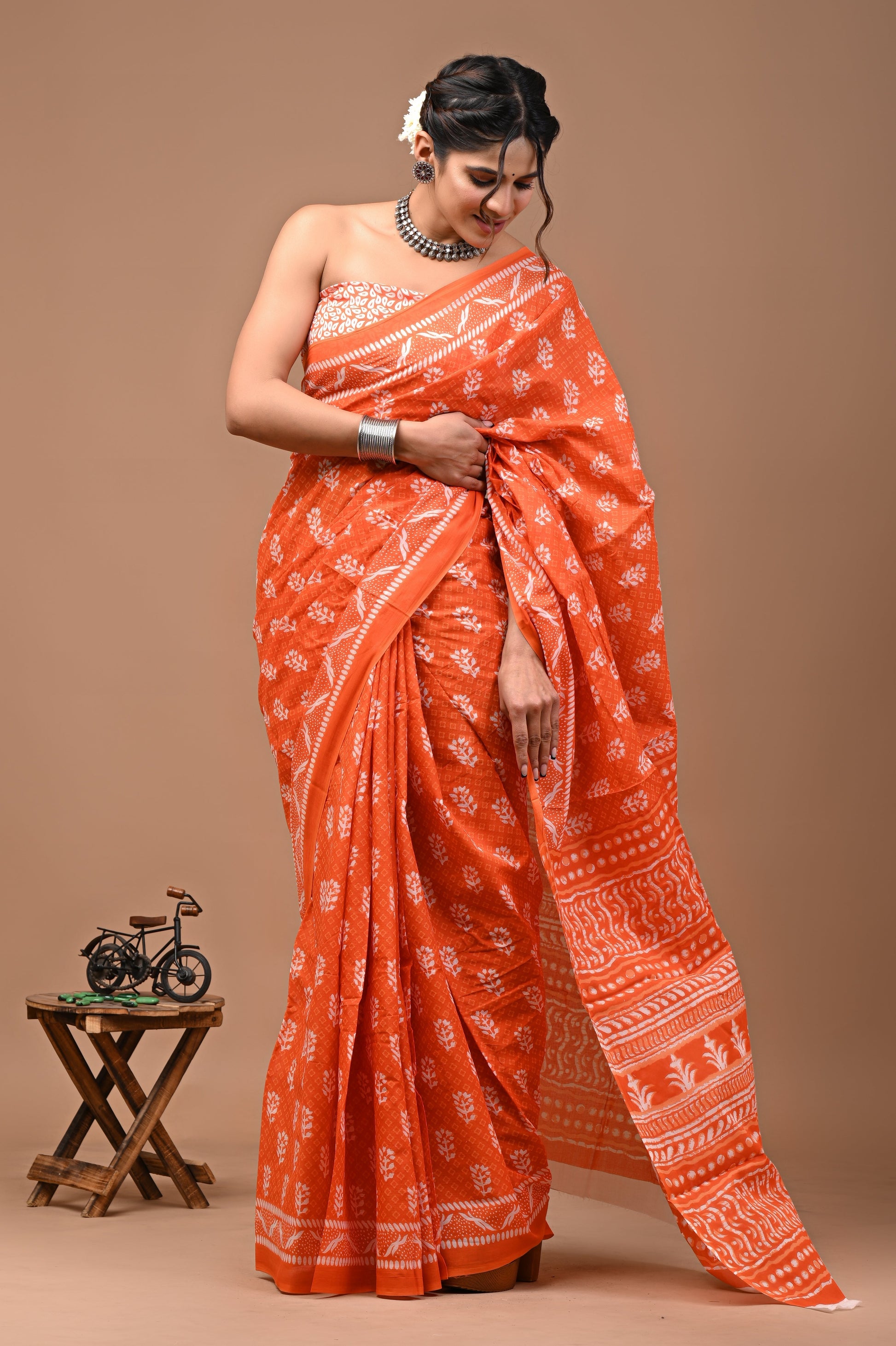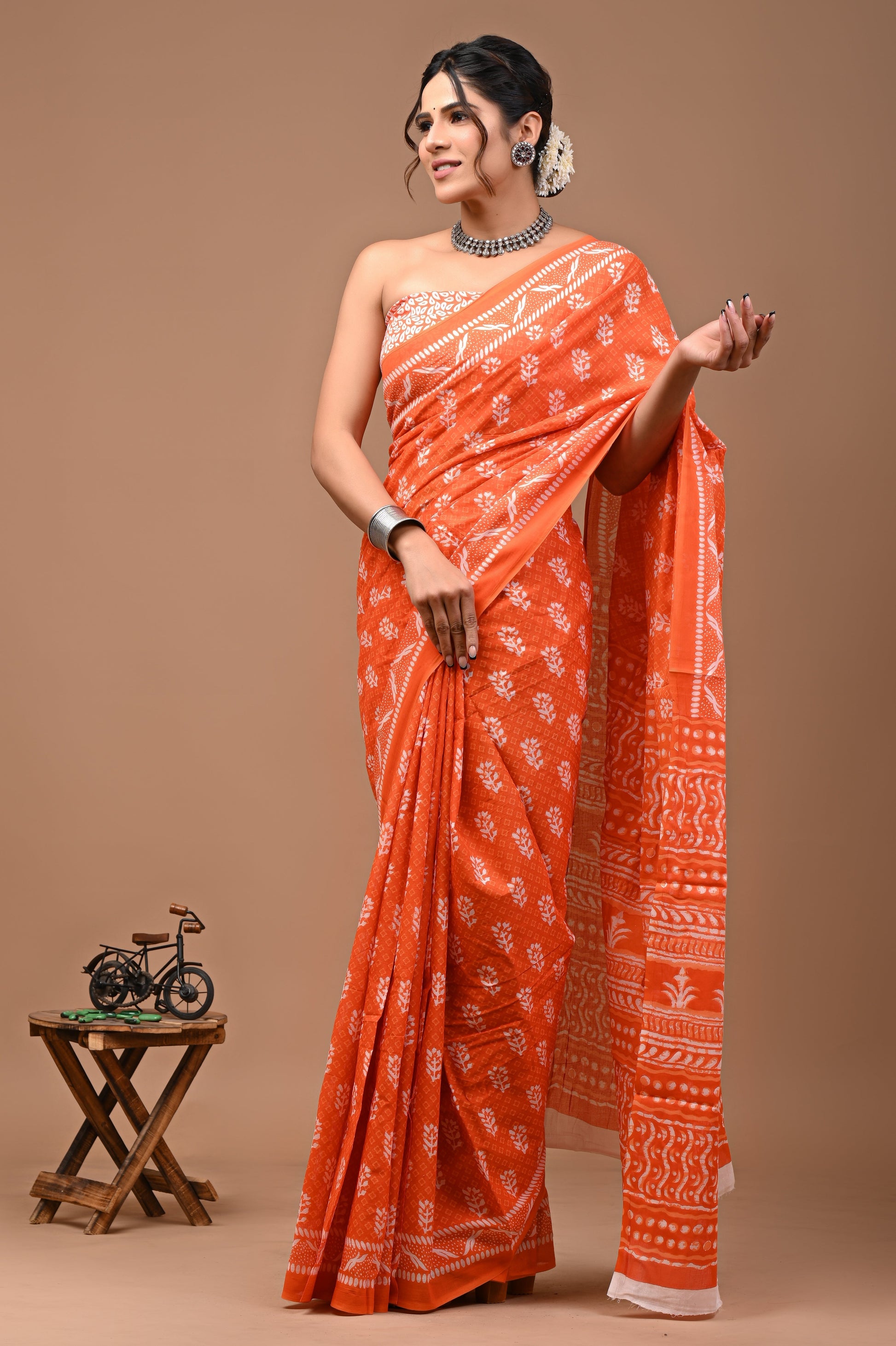 - FABRIC : Mulmul Cotton saree with similar fabric Blouse pc || Work: Printed ,Block print ,Traditional Ethnic Look