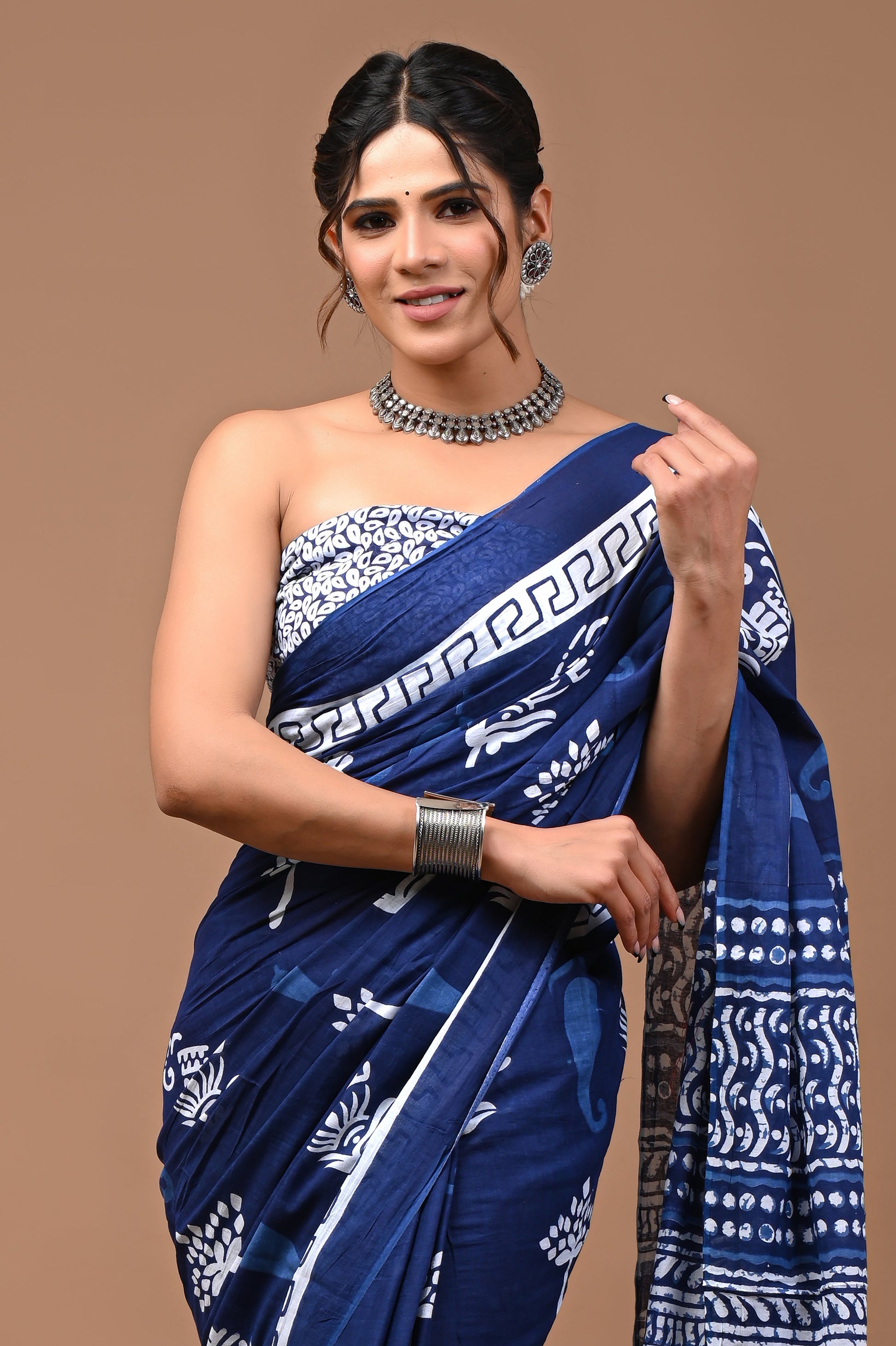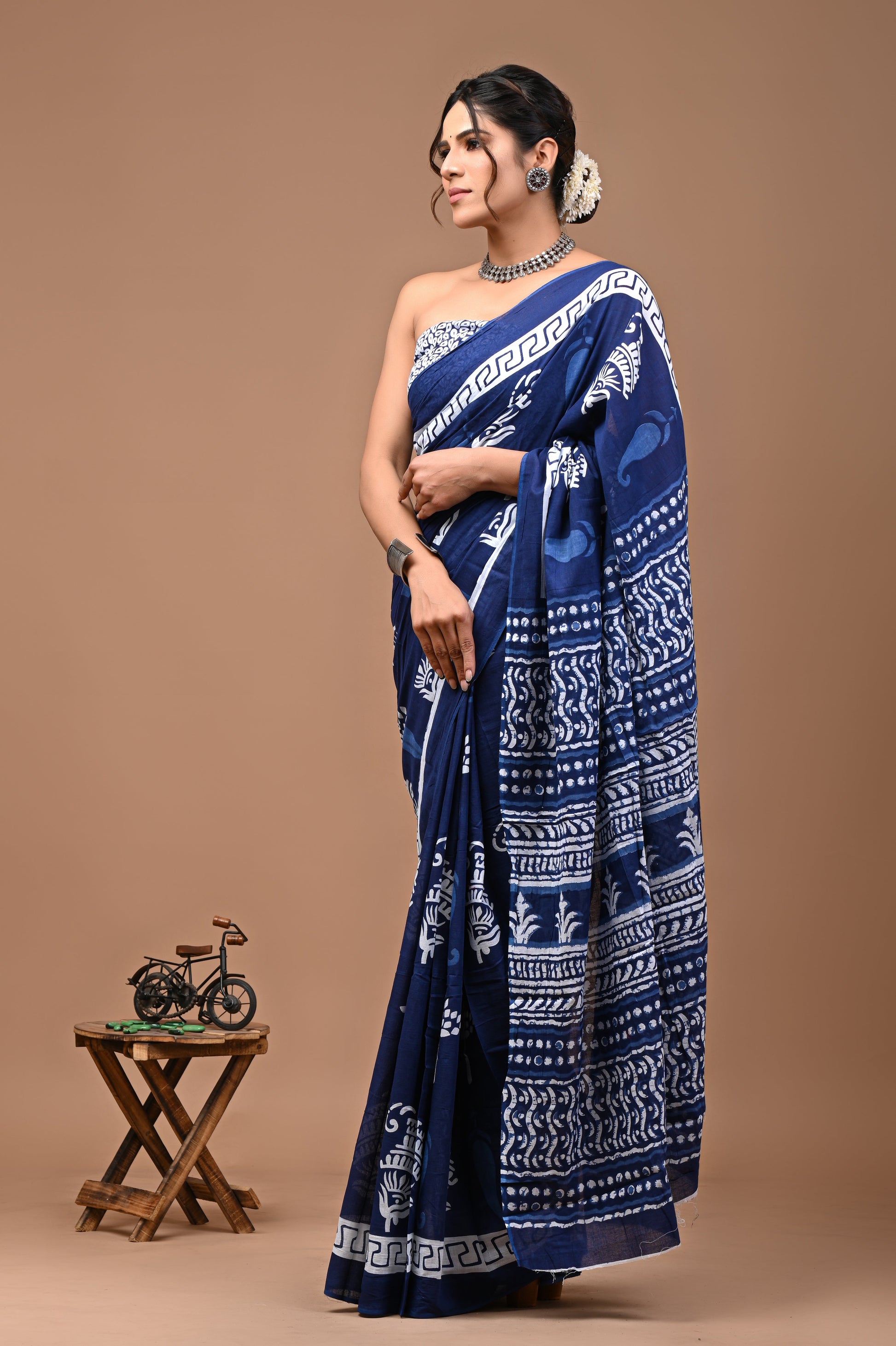- FABRIC : Mulmul Cotton saree with similar fabric Blouse pc || Work: Printed ,Block print ,Traditional Ethnic Look