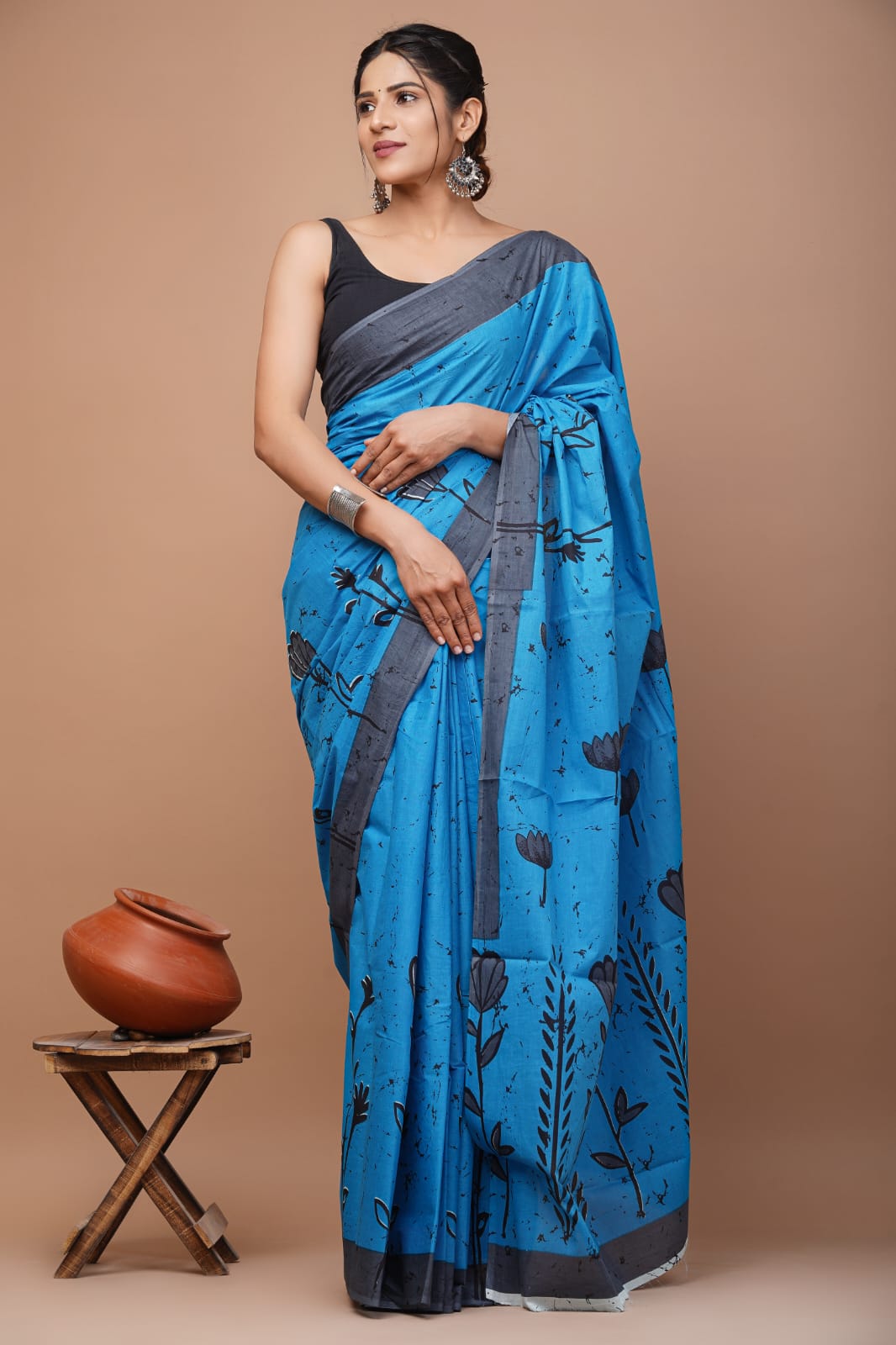 - FABRIC : Mulmul Cotton saree with similar fabric Blouse pc || Work: Printed ,Block print ,Traditional Ethnic Look