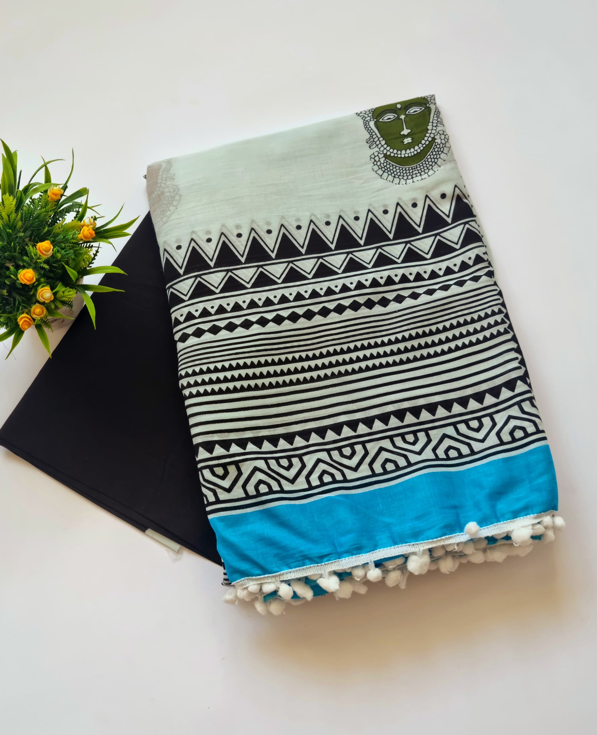 Printed Pure Cotton Mulmul Saree With PomPom Lace