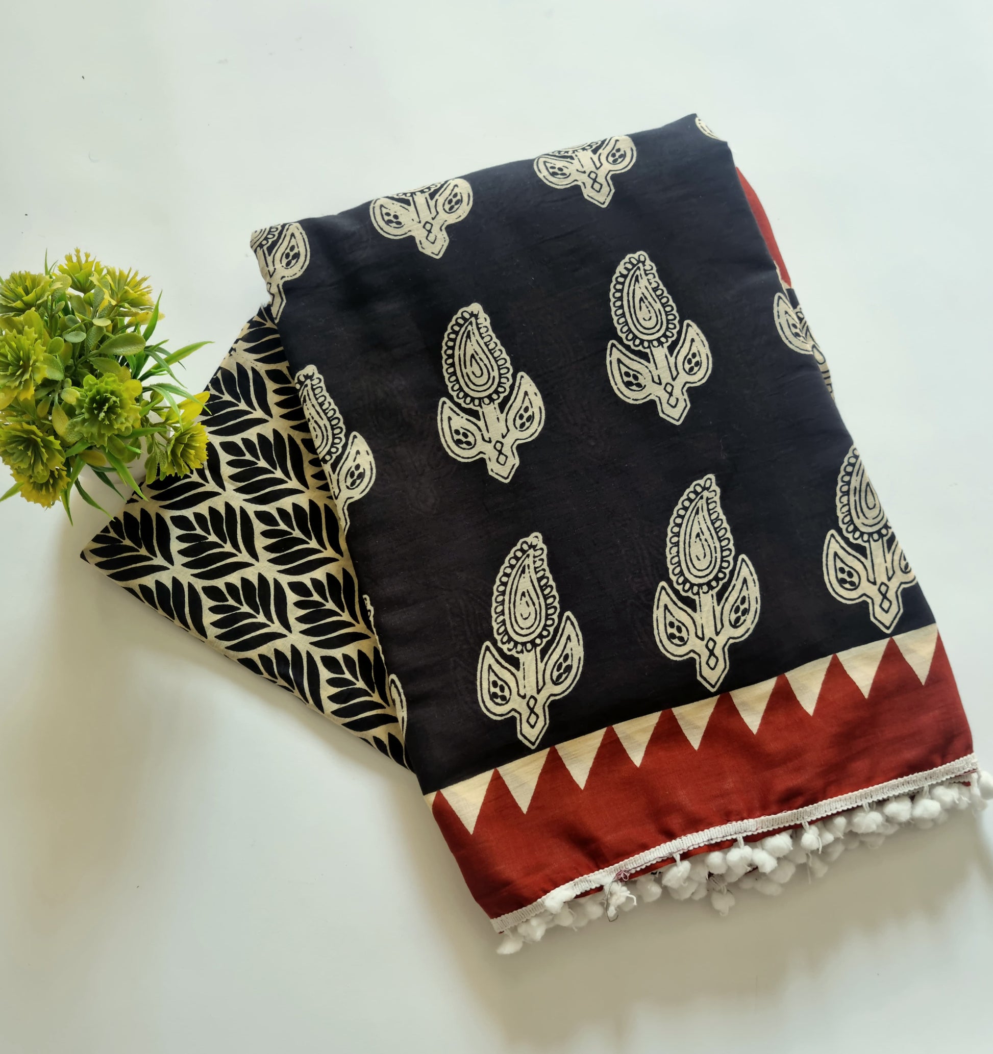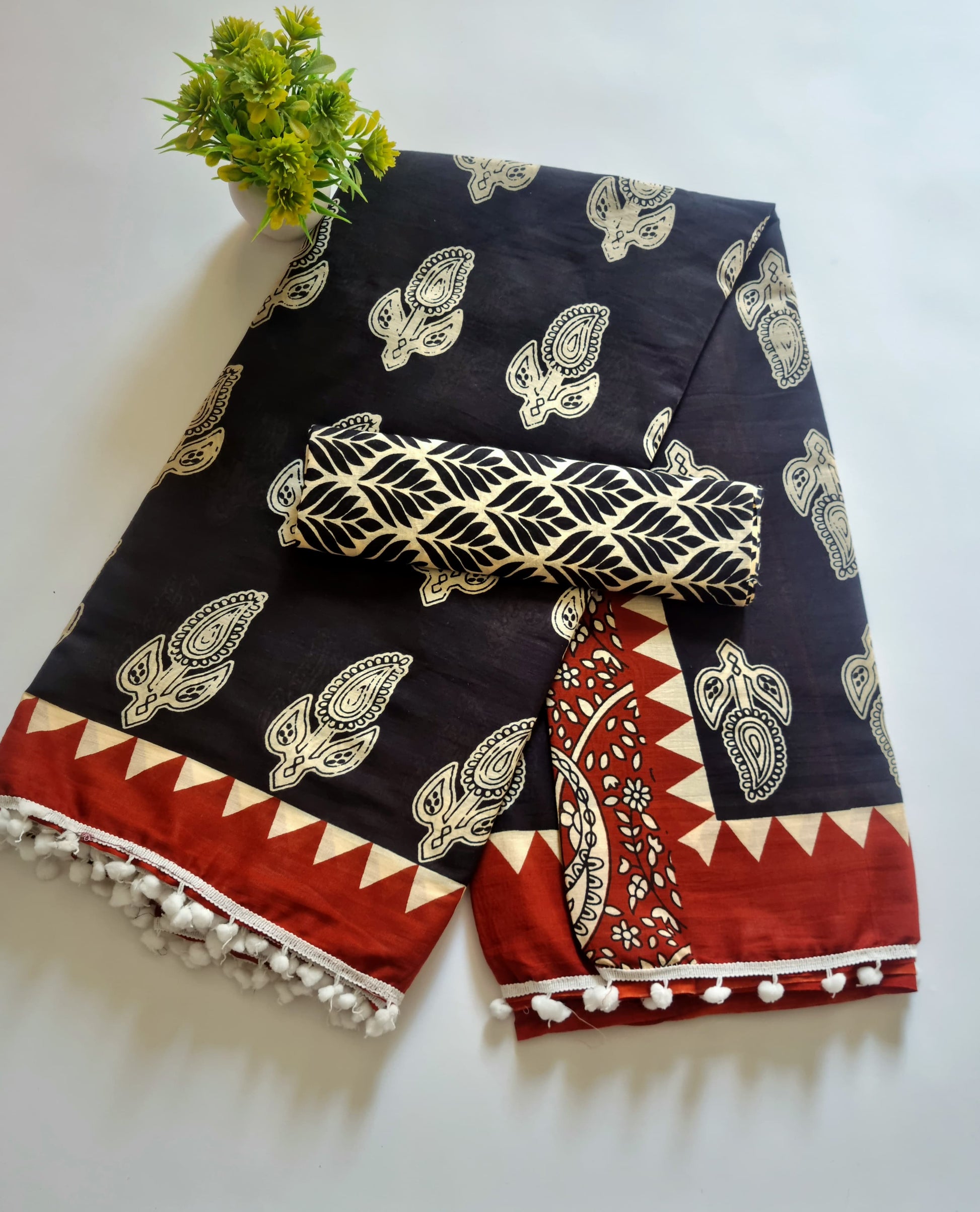 - FABRIC : Mulmul Cotton saree with similar fabric Blouse pc || Work: Printed ,Block print ,Traditional Ethnic Look